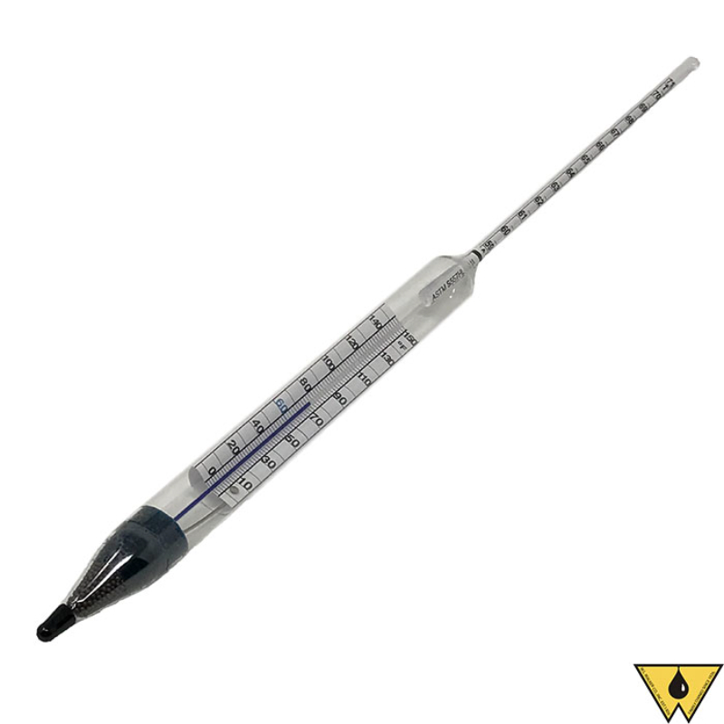 API Chapter 9.3 of the MPMS, ASTM D1298, and E1000. These instruments combine API gravity scale with a thermometer in the body and are the standard and preferred size normally used for determining the gravity of crude oil and other liquid petroleum products, Length approximately 15 inch (374 to 387 mm), diameter ¾ to 1 inch (18 to 25 mm). Thermometer range is 0 to 150°F.