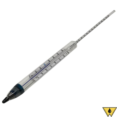 API Chapter 9.3 of the MPMS, ASTM D1298, and E1000. These instruments combine API gravity scale with a thermometer in the body and are the standard and preferred size normally used for determining the gravity of crude oil and other liquid petroleum products, Length approximately 15 inch (374 to 387 mm), diameter ¾ to 1 inch (18 to 25 mm). Thermometer range is 0 to 150°F.